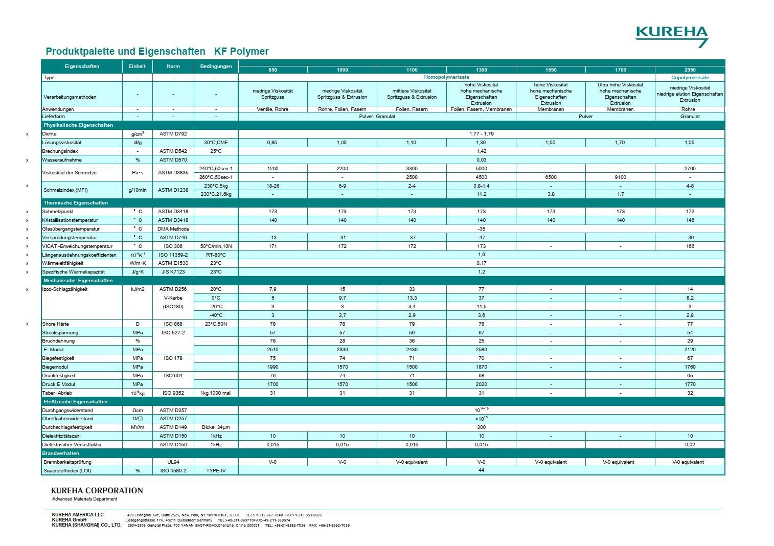 Die Kristallinität und der Schmelzpunkt des KF Polymer sind daher etwas höher als bei anderen kommerziellen, vergleichbaren PVDF-Typen.